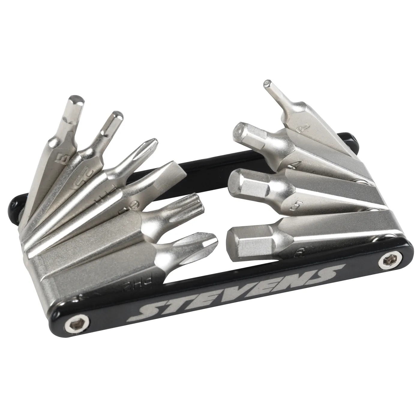 A STEVENS Multitool 10 alapvető szerszámfejet tartalmaz, így értékes társ minden kerékpáros számára. A készlet része egy 2 mm-es, 2,5 mm-es, 3 mm-es, 4 mm-es, 5 mm-es és 6 mm-es imbuszkulcs, egy laposfejű csavarhúzó, két különböző méretű csillagfejű csavarhúzó, valamint egy Torx 25-ös kulcs, amelyekkel útközben is elvégezhetők a legfontosabb javítások, beállítások és szerelések. A masszív szerszám könnyű, elfér a mez zsebében és természetesen STEVENS logóval van ellátva.